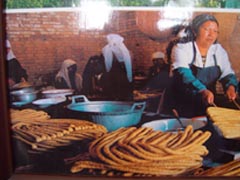 馓子这道油炸面食据传有一千多年的历史。宋代文豪苏东坡诗赞它为"纤手搓来玉色匀,碧油煎出嫩黄深"。把馓子的色香味概括无余。吴忠回族擅长炸制馓子,并且十分钟爱这种美食。每逢开斋节、古尔邦节等民族节日,回族家庭都炸馓子招待客人,馈赠邻里。制作方法是:将精面粉加入盐水揉和,反复揉压后,搓成粗条,抹上食用油放入盆中醒面。待油锅热时,将面条制成并列成环状,入油锅炸至金黄色,捞出凉干即可食用。特点是造型优美,香脆可口。