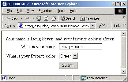 <> 0 Then Response.Write "Your name is " Response.Write Request.Form("txtName") Response.Write ", and your favorite color is " Response.Write Request.Form("selColor")