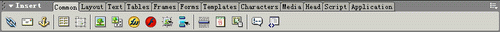 Insert对象面板的内容也有不小变化。Common中增加了tag chooser,可以自由的插入任何html、asp、jsp、php.......的标记和语句(具体情况我们在后面会讲到)。