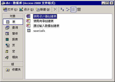 保存数据库后我们看到的是下面的界面,双击使用设计器创建表,开始创建一个数据表。我们这里的应用你只需照着步骤一步步做下去,即使你以前从没接触过数据库也没有问题,如果你想做深层次的应用,涉及到关系结构的话,那最好还是找一本数据库的书来看看。