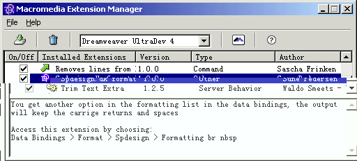 接下来我向各位推荐一款可以解决这个难题的UltraDev插件: 使用方法很简单,只需在选择动态数据后应用该插件的命令即可完成空格和换行的格式化。
