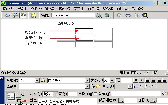 ◇合并单元格:按Ctrl,点单元格,选中表格,在属性面板中点“合并所选单元格,使用跨度”。