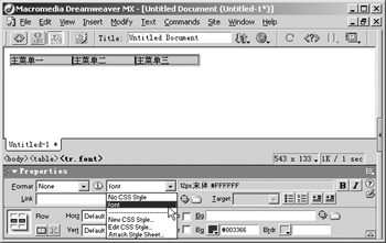 Padding”、“Cell Spacing”以及“Border”参数(如图1)。在建立的表格中输入主菜单导航文字,选取表格及文字后,用快捷键“Ctrl+F3”打开其属性窗口,我们可以定义一个字体控制CSS来控制文字属性,调整相关参数(如图2)。