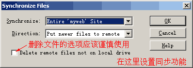 同样,如果我们选择“Get Newer Files from Remote”,并选中删除复选框,可以将远程站点较新文件下载到本地,并将删除本地站点上存在但远程站点没有的那些文件。如果你是在本地编辑网页并上传,一定要慎用此命令,防止误删除。
