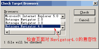 我们一般选择“IE 4.0”和“Netscape4.0”检查即可,如果检查结果发现有浏览器不支持的地方,我们在测试结果窗口中能够看到是哪个语句有问题,我们只须做相应的修改即可。