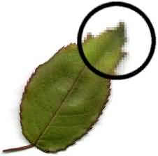 点阵图形是以称之为像素的彩色点来描绘图象,例如,下图的树叶,它 是由特定的位置和每个像素的色值来确定的,如同"玛赛克"一样的方式形成