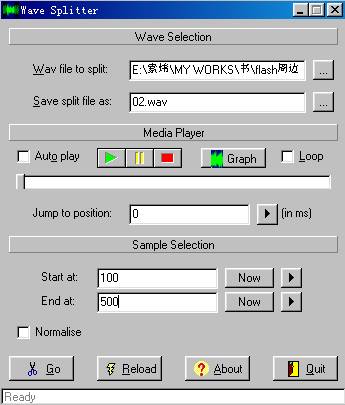 to position”可以直接跳到您指定的位置进行播放,下面的”sample selector”部分是用来设置您所要截取的wav文件的开始和结束的位置,中间的部分就是最后要输出的新的wav文件,最下面的四个按钮分别是”开始截取”,”重新加载wav文件”,”关于”和”推出”,下面我们来看看具体如何来使用Wave