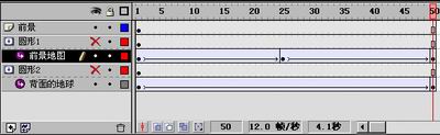2、新建一个图层,取名为“圆形1”,把图库中的“圆形”拖拽到该层中,调整位置使其和“前景”图层中的圆形重合,并在50帧处插入帧。新建一个图层,取名为“前景地图”,在第一帧插入关键帧,把刚才做好的图库“地图”拖入,调整地图的位置使非洲刚好超出圆形一点;在25帧插入关键帧,向左移动地图到南北美洲,使南北美洲在圆形的中心;最后在50帧处插入关键帧,继续移动地图,使第二个非洲刚好超出圆形一点,这样安排地图位置的好处是动画在播放时更加流畅,不至于有打更现象。然后分别把第1帧到25帧和25帧到50帧设置为“Motion