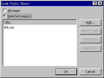 pages"单选钮可以将样式文件应用到网站所有网页中,而"Selected pages"只在当前编辑网页中使用,一般我们多选择后者.