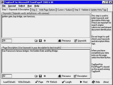 你可以从「开始」按钮的程序清单里面调用这个软件,如果你直接从 FrontPage 中调用它(选择「自定义> 执行 TagGen」),那么很多选项设定便可以自动预先填写好。这个软件很容易使用,只需要跟随它设定好的三个步骤去做就行了。首先请填写好步骤一所需的信息,如图7所示。
