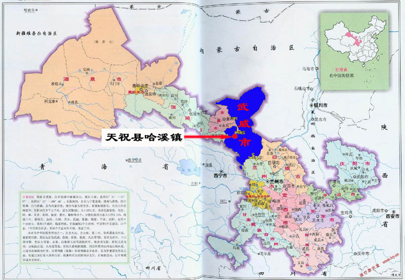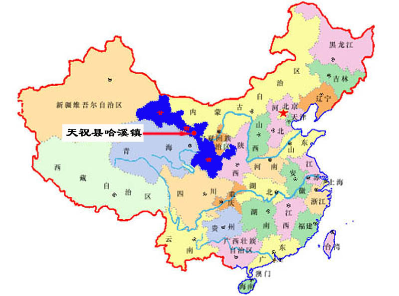 甘肃省天祝藏族自治县哈溪镇,“哈溪”一词在藏族语中意为“父王营地”。哈溪镇由于位于青藏高原和黄土高原边缘地带,海拔在2000——4146千米之间,年平均气温1.5℃,所以镇子中大部分地区都是全年积雪的大山。并有哈溪河、峡门河、夹道沟河、黑沟河、柳沟河等河流在镇内发源。森林覆盖面广,在森林中有国家级保护动物褐马鸡等珍稀动物。
