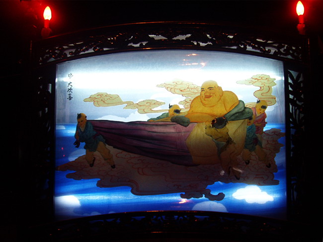 排灯距今有200多年的历史,在长期的发展演变过程中,凝聚了人民群众高超的艺术才华和智慧,具有高超艺术特色价值。 1、观赏性:以古典人物、历史故事、传说、山水花鸟等为 内容的绘画艺术,绚丽多彩、古朴典雅; 2、艺术性:聚县内比较有名气的绘画、书法、剪纸、雕刻等艺人各显其能,构思巧妙,形象逼真。 3、群众性:能够吸引观众,群众参与性强,喜闻乐见。 <双鱼形人物画> 4、趣味性:排灯画面内容包罗万象,男女无别, 老少皆宜,因此具有观赏价值,民族学研究价值和收藏价值。