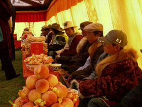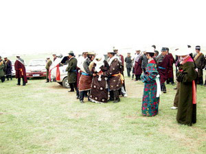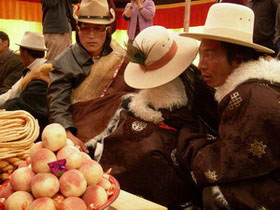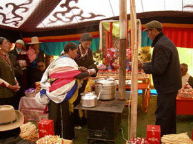 藏族一般实行一夫一妻制,同姓不结婚。其婚姻恋爱自由,双方经相互了解加深感情,同意结为夫妻时,各自向父母表明态度,求得老人们的同意后,由媒人带上哈达、酒、茶等礼物到女方家求婚,同意后商定结婚吉日。结婚的前一天,媒人陪新郎到女方家迎亲,女方家酒肉招待,出嫁姑娘开始梳妆打扮,做好出嫁准备。第二天家人和亲人携带陪嫁礼物送亲。男方派出迎新队,带着“哈达”和酒在中途迎亲。新娘围娘家帐房转三圈后随送亲队伍起程,到达男方家后新娘下马,随歌曲过毡进帐,由僧侣念经,向姑娘头上浇净水,表示祝福,姑娘绕火堆三圈后入洞房。