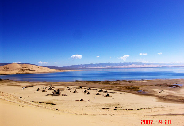沙岛其实并不是岛,而是位于青海湖畔约 50 平方公里的沙丘。因湖沙垄突出水面接受风沙堆积而成,恰似一个新月新型沙丘漂浮在水面上。它与湖东岸连绵起伏的沙山,构成独特的沙漠景观,它将蓝天、碧水、黄沙混为一体,以优美的自然风光、独特的沙丘景观,并以及北临金银滩、南依青海湖的独特地理位置,吸引着越来越多的游客来此观光度假。 |