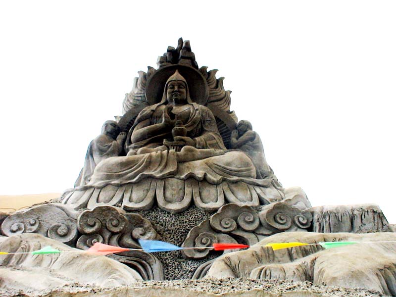 | 形象表现:以格鲁派(黄教)创始人宗喀巴大师为主体人物造型。在整体形象上以大师为中心辅以两徒弟成三角形,用莲花形座椅为底座,凸显藏传佛教界一代大师的虔心真诚,慈悲广博。 |