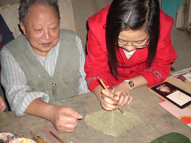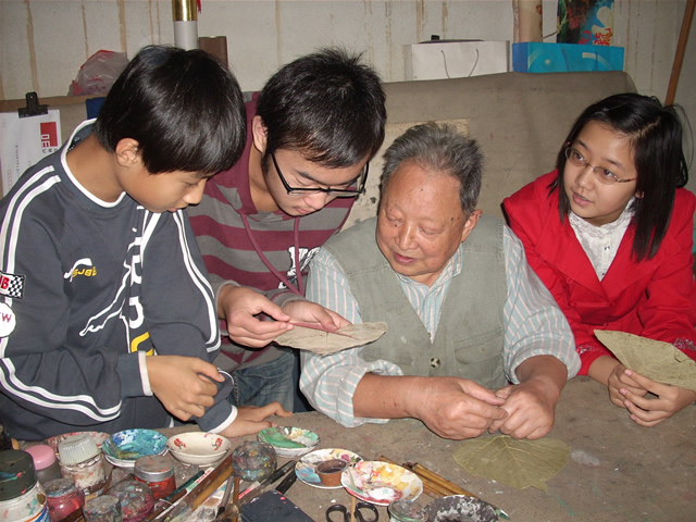 孙爷爷端出一个旧的纸盒子,从里面拿出几张完整无缺的脉叶,那就是将叶肉已经去掉,但还未作画的"叶纸",上面的叶脉清晰可见,纹理十分漂亮.孙爷爷让我们尝试着在上面画画,我们欣喜若狂,赶紧拿起笔,调好色迫不及待的往上面作画.另外两名同学很快在上面画好了,叶上的荷花或者人物,都栩栩如生.他们还感叹着:“这叶脉可还真好画,就像纸一样。”“画出来的效果感觉比纸还好,多环保呀。”