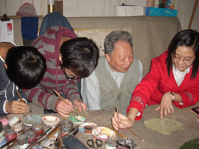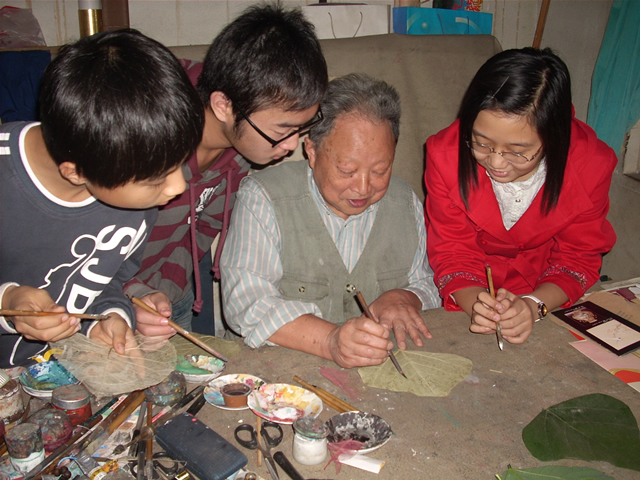 一片脉叶的制作要花几十道工序,费时一个多月,我们的脉叶制作失败,重新开始时间又不够了,我们都有些沮丧,孙爷爷便慷慨的拿出他以前制作好的脉叶,让我们尝试作画。高兴之余,我们自然迫不及待地想要一试身手了。孙爷爷也拿出几张制好的脉叶,和我们一起作画。走进孙爷爷的画室,我们被眼前的景象惊呆了,满屋的长长短短的画笔,大大小小的颜料盘,还有摆放地高高低低的装裱过的叶脉画……这足以显现出孙爷爷对叶脉画的热爱,以及叶脉画能影响他们家三代人的原因了。