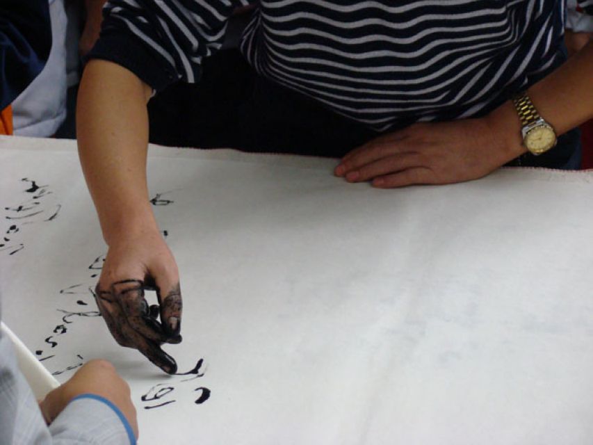 Finger calligraphy is a unique work of art. The most difficult in finger calligraphy is using fingers to dip ink and the amount of ink is limited so that you need to write exactly on the paper with rapidly in a limited time. When writing, you should decide to whether to use the thumb or the middle finger or little finger according to the size of the character. As a result, it’s more difficult to write with fingers than with a writing brush or a pen. Using fingers, one can write standard script, running script and cursive script.