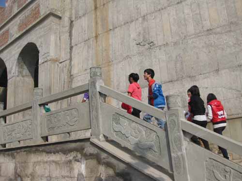 我们小组的同学徜徉山水,心清气爽,从景区背后白塔山向上,是一条陡峭的崎岖山道,顺山道攀升而上,至山顶有一平台,平台上矗立的便是具有悠久历史的“崇霞宝塔”了。