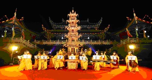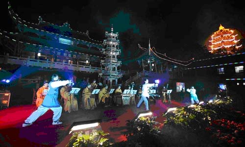 我们在采访中,还有幸欣赏到一台颇具神秘色彩的道家音乐茶会。 夜不醉人,道乡品茗人自醉;道家音乐的温柔、沁入心扉,一切景物在朦胧中表现得从从容容,道家仙乐“天女散花”、太极拳音乐、道家武术等极富道教特色表演节目,让我们在道教文化园真武宫体验了道家茶会音乐和道家茶艺的精华。