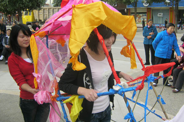 我们还亲自学了灯戏的表演,瞧!这位队员,站在“车灯”里,情不自禁的表演起来,这种感觉真的很好,仿佛融入到了戏中的角色,表演得很投入。