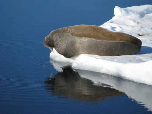 随着北极海冰的融化,海象也将是受害的物种之一。在北极地区的太平洋中,大部分北极海象都生活在那里。海冰是它们重要的交通工具,这种安全平台可以将母海象和刚刚出生的幼仔送到食物丰富的海域中。随着海冰的消失,许多幼仔将会淹死在海水中或是因为找不到食物而饿死。