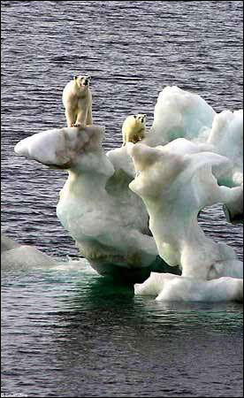 北极海冰也在不断融化。1993年夏天,北极海冰覆盖面积约为750万平方公里。到2007年9月,北极海冰覆盖面积仅剩430万平方公里。据估计,北极海冰即将面临再一次的大面积崩塌。在北极海冰融化过程中,北极熊将是最大的受害者。图中这头雌性北极熊正站在一块浮冰上在科考船周围巡游。尽管严禁捕猎北极熊,但它们终将逃不脱气候变暖所带来的灾难。美国科学家曾经在一份研究报告中警告,到2050年,北极熊或将灭绝。