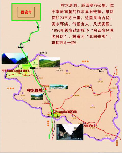 ,请谨慎驾驶。凤凰镇是座落在秦岭南麓的一座古镇,有保存完好的具有典型江南风情的徽派古民居。那里不但生活着勤劳淳朴的乡民、清代钱庄、四合院,而且至今还保留了许多民俗文化和传统工艺,如采制中药、饲养柞蚕和纺丝的作坊、铁匠铺等。对整日在喧闹的城市中忙碌的城里人来说,这里无疑是一处寻古探幽的绝佳之地。溶洞景区与凤凰古镇及沿途集镇均可品尝到具有正宗地方风味的农家美食。到柞水旅游您可一定别忘了给亲戚朋友带回当地的土特山产。