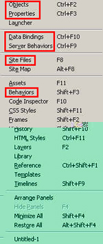 相信使用过Dreamweaver的朋友们应该比较熟悉这些菜单的应用。红色框框住的选项是我们以后会经常用到的。接下来,我们再详细的看看Insert菜单和Window菜单的内容。